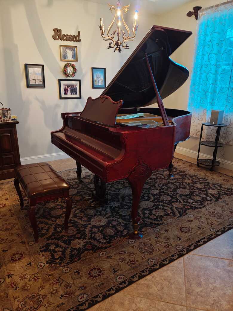 Beautiful Burgundy Well loved Piano and bench